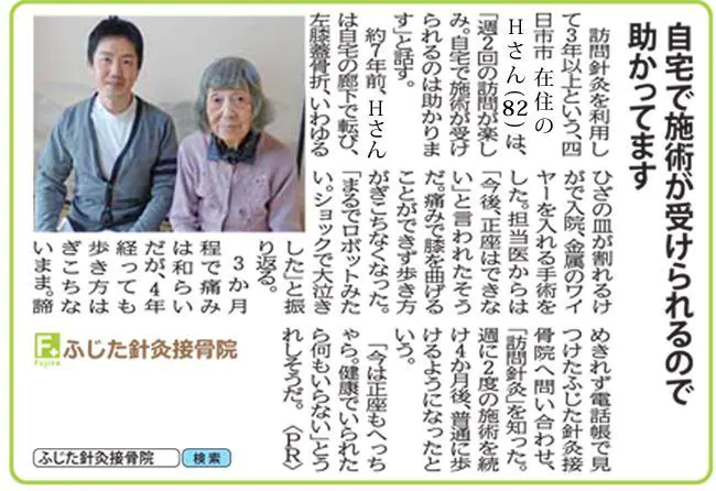 3か月程で痛みは和らいだが、4年経っても歩き方はぎこちないまま。諦めきれず電話帳で見つけたふじた鍼灸接骨院へ問い合わせ、「訪問鍼灸」を知った。週に2度の施術を続け4か月後、普通に歩けるようになったという。