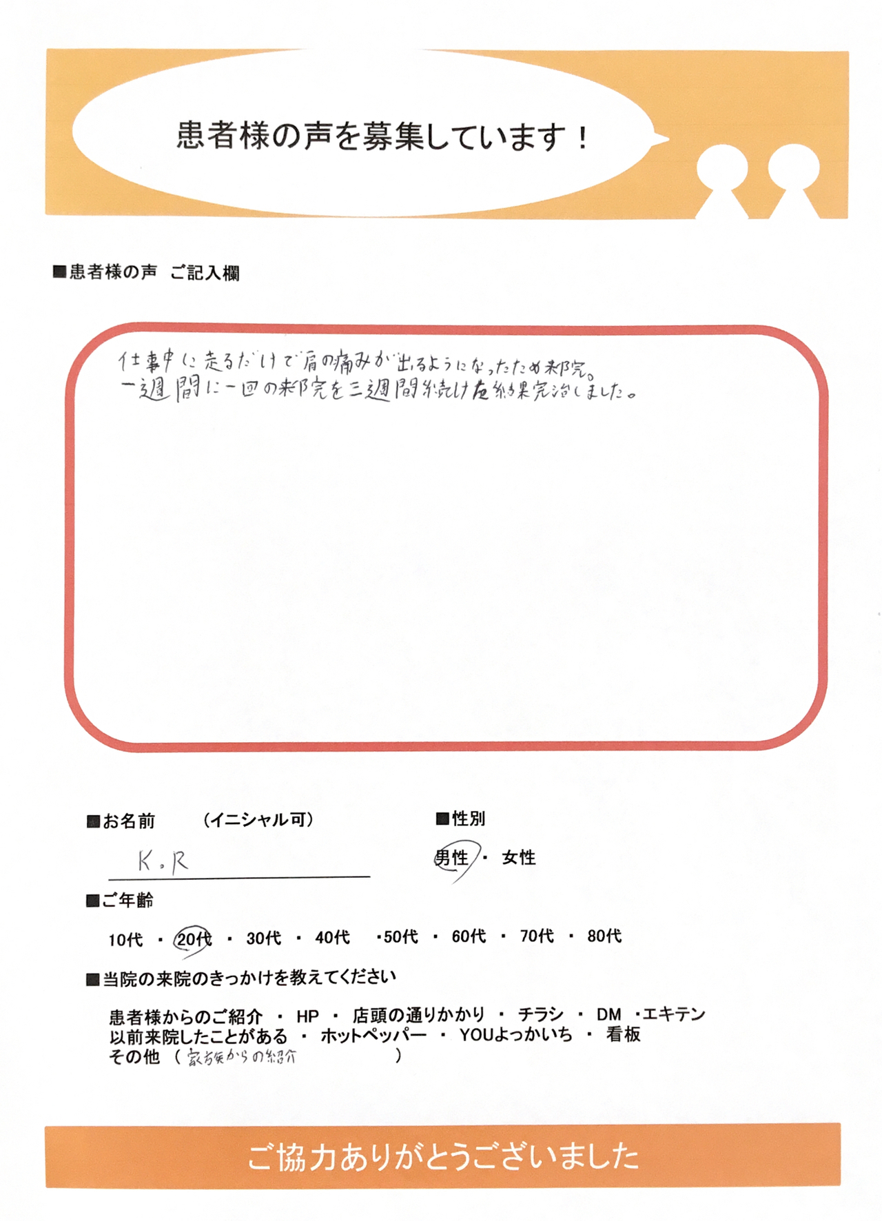 | 2026/3/23 | 肩の痛みで通院されていた【患者様の声】です 仕事中に走るだけで肩の痛みが出るようになったため来院。一週間に一回の来院を三週間続けた結果完治しました。 |