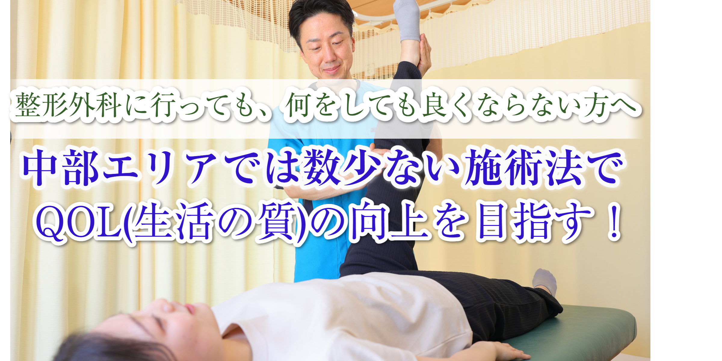 〇当院の院長、藤田武俊は、東海地区でも数少ない施術法を駆使し、21年以上、延べ8万人以上の臨床経験を持つ、信頼と実績を誇る施術の専門家です。これまでに、手術を避けたい方や、薬に頼らずに痛みを解消したい方にも数多く成果を上げており、どこに行っても改善しなかった症状の改善例も多数あります。