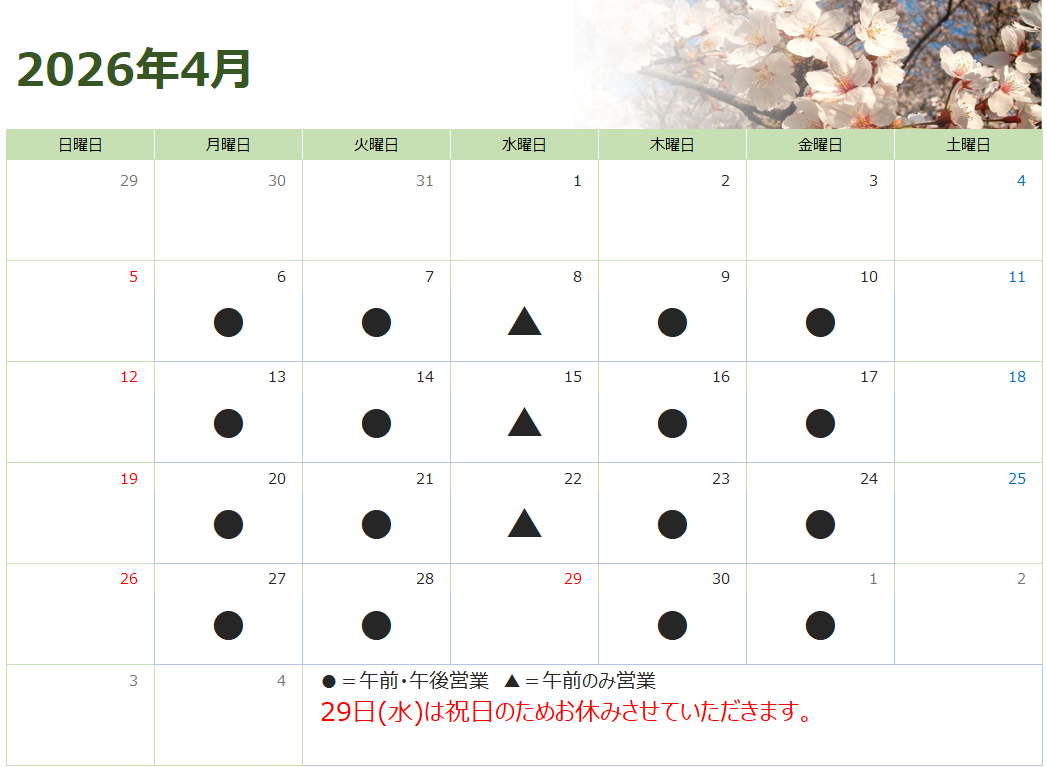 | 2026/3/26 | 4月の営業日のご案内です。 4/29(水)は祝日のためお休みさせていただきます。 皆様には大変ご不便をおかけいたしますが、よろしくお願いいたします。 また、引き続き口コミ投稿キャンペーンを開催しております。ご投稿ごとに『入浴剤』をプレゼントいたします。 サービス向上のため、ご協力いただけますと幸いです。 |