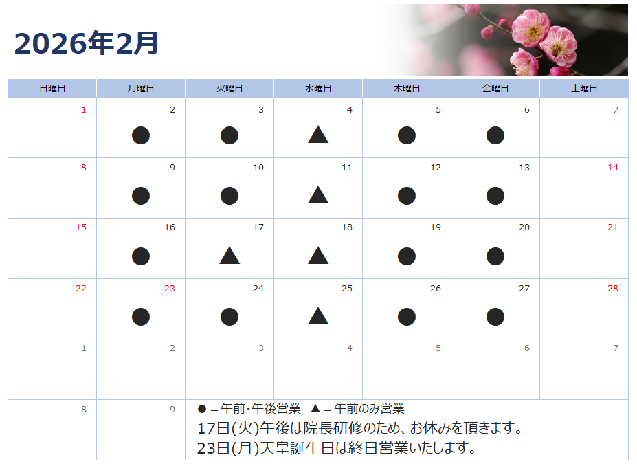 | 2026/1/22 | 2月の営業日のご案内です。 2/17(火)は院長研修のため、午後のみお休みを頂戴いたします。 2/23(月)は天皇誕生日ですが、終日営業いたします。 皆様には大変ご不便をおかけいたしますが、よろしくお願いいたします。 |
