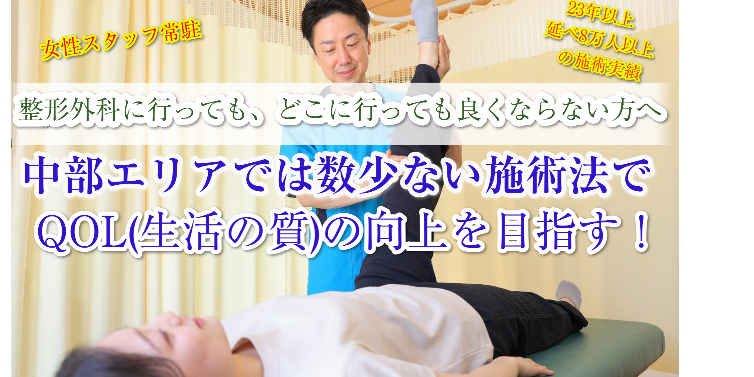 〇当院の院長・藤田武俊は、東海地区でも数少ない施術法を駆使し、本場のカイロプラクティックや東洋医学の考え方など、さまざまな施術法に基づき、22年以上・延べ8万人以上の臨床経験を持つ、信頼と実績を誇る施術の専門家です。これまでに、手術を避けたい方や、薬に頼らずに痛みを解消したい方にも数多くの成果を上げており、どこへ行っても改善しなかった症状が改善した例も多数あります。