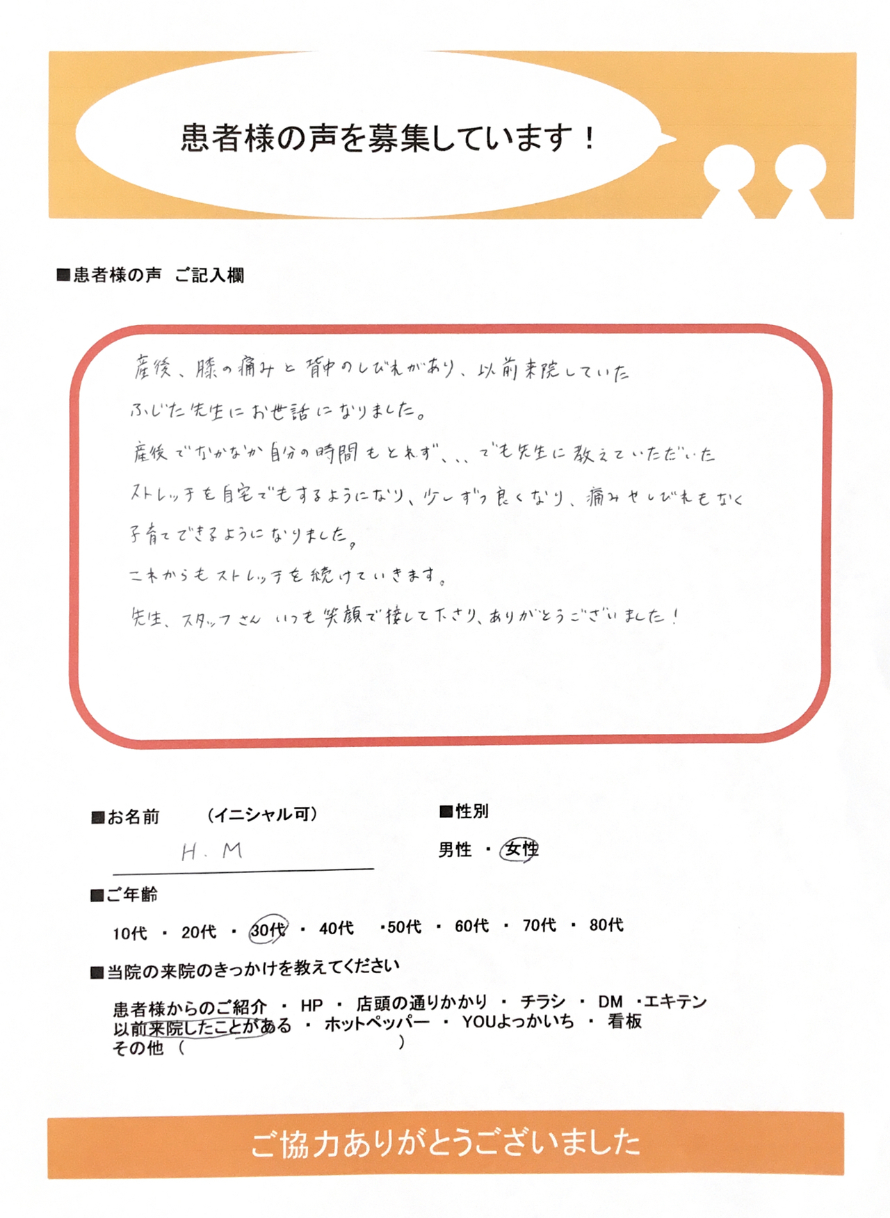 産後、膝の痛みと背中のしびれがあり、以前来院していたふじた先生にお世話になりました。