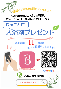 | 2025/10/31 | 口コミキャンペーンのお知らせです 11月は口コミ投稿ごとに、体が温まる『入浴剤』をプレゼントいたします! Googleの口コミは1回限り、ホットペッパービューティーの口コミは何度でも投稿できます。 引き続きサービス向上のため、クチコミ投稿をよろしくお願いいたします。 |
