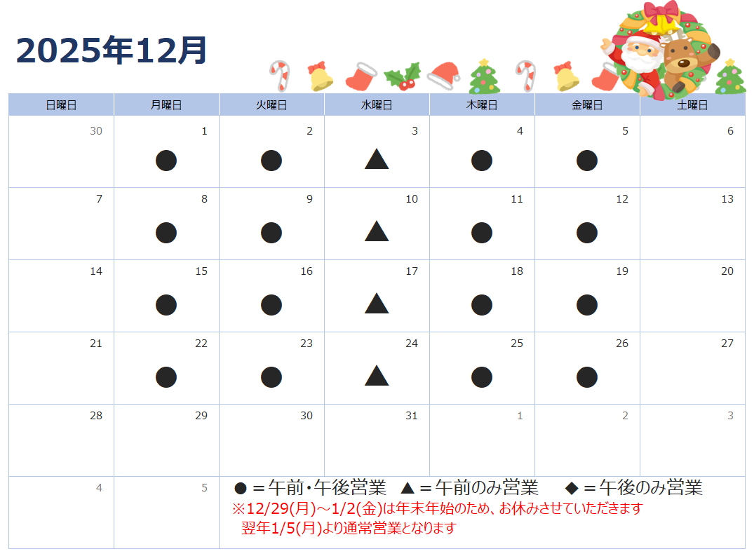 | 2025/10/30 | 11月の営業日のご案内です。 11月3日(月)は午後のみ営業いたします。24日(月)は祝日のためお休みとさせていただきます。 皆様には大変ご不便をおかけいたしますが、よろしくお願いいたします。 |