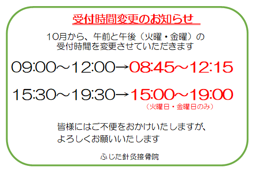 | 2025/10/1 | 受付時間変更のお知らせ 10月から 午前と午後(火曜日・金曜日)の受付時間を変更させていただきます。 09:00~12:00⇒08:45~12:15 15:30~19:30⇒15:00~19:00 (火曜日・金曜日) 皆様には大変ご不便をおかけいたしますが、よろしくお願いいたします |