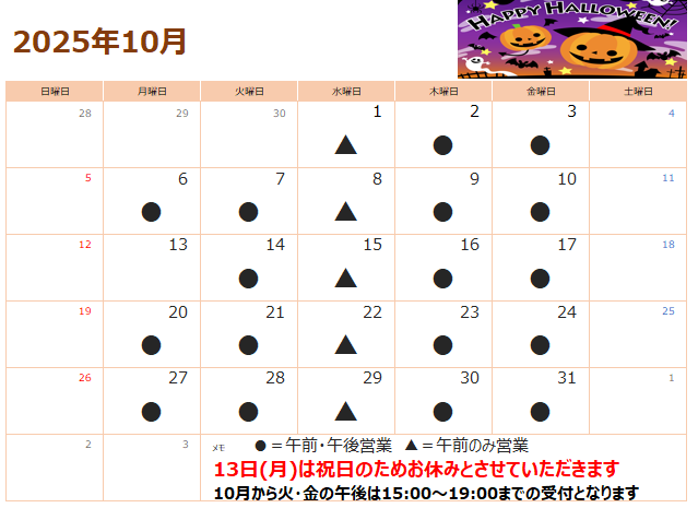 | 2025/10/1 | 10月の営業日のご案内です。 10月13日(月)は祝日のためお休みとさせていただきます。 よろしくお願いいたします。 |