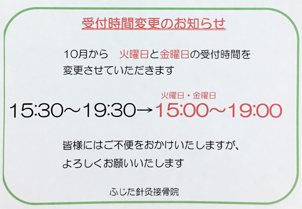 2025/9/8 | 受付時間の変更のお知らせ 10月から、火曜日と金曜日の受付時間を変更させていただきます。 火・金 15:30~19:30→15:00~19:00 月曜日と木曜日は今までどおり 15:30~19:30の受付となります 皆様にはたいへんご不便をおかけいたしますが、何卒よろしくお願いいたします。 |