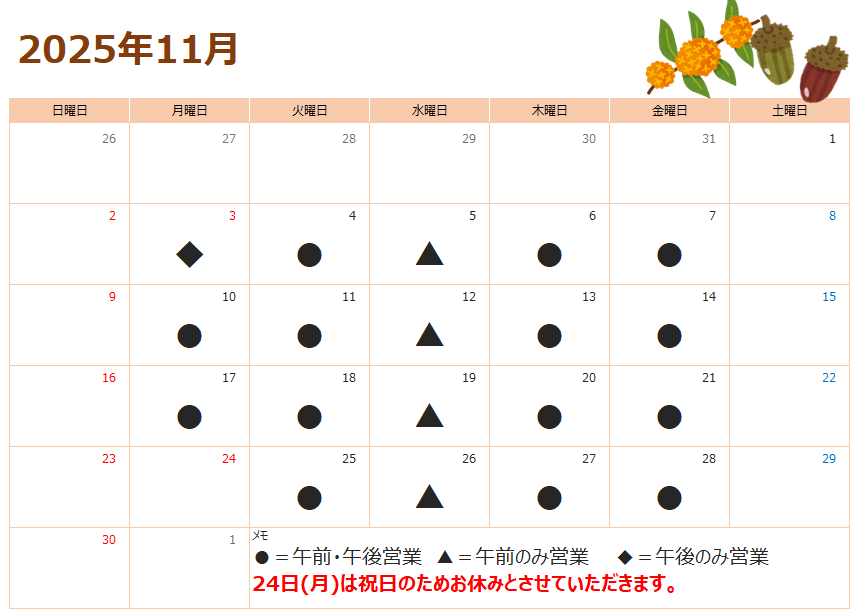 | 2024/10/30 | 11月4日(月)は文化の日の振替休日で祝日ですが、終日営業いたします |