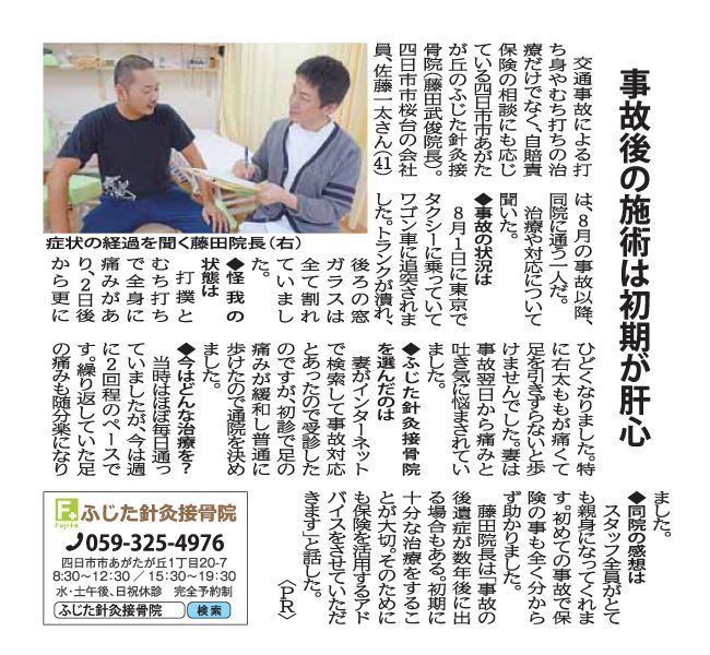 今回の事故で、頭痛、眠気、気分不良、左下股しびれあり、早く治したいので、HPを検索したところ、ふじた接骨院に出会いました。鍼ですぐ気分不良がとれ、頭痛、頸椎痛、ひどい肩こりまで楽になりました。