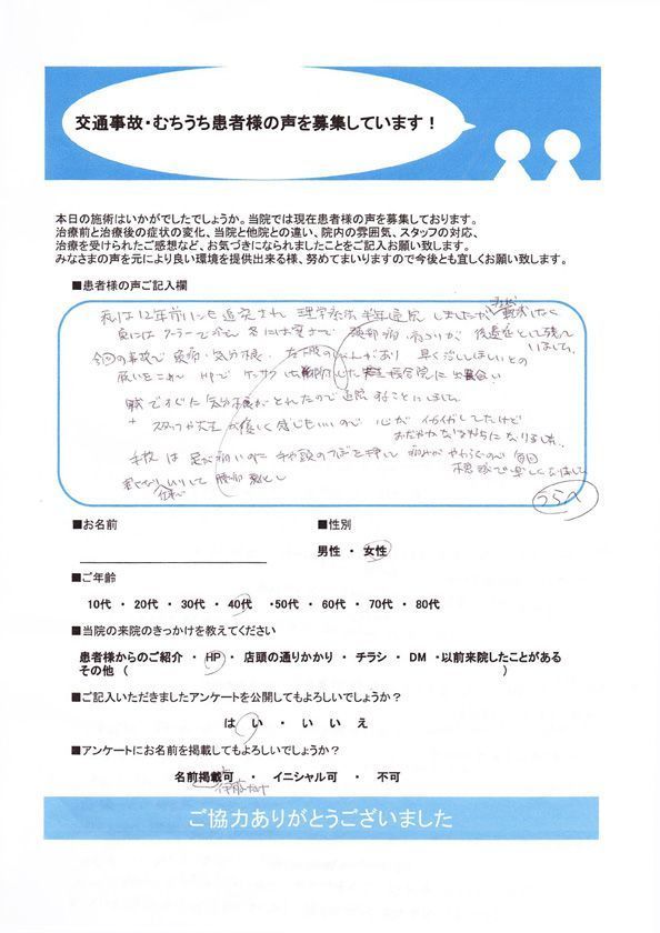 交通事故で整形外科だけでは治らないと思っていたので、近所にこんな親身に治療して頂ける接骨院があってありがたかったです。また何かあればよろしくお願いします。