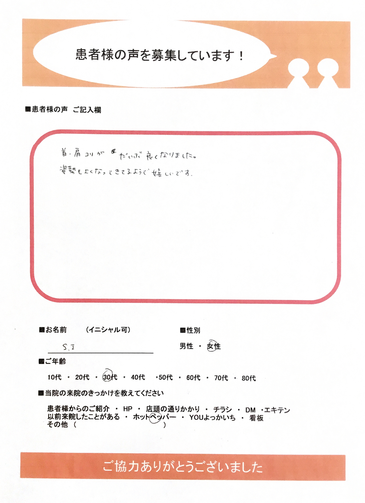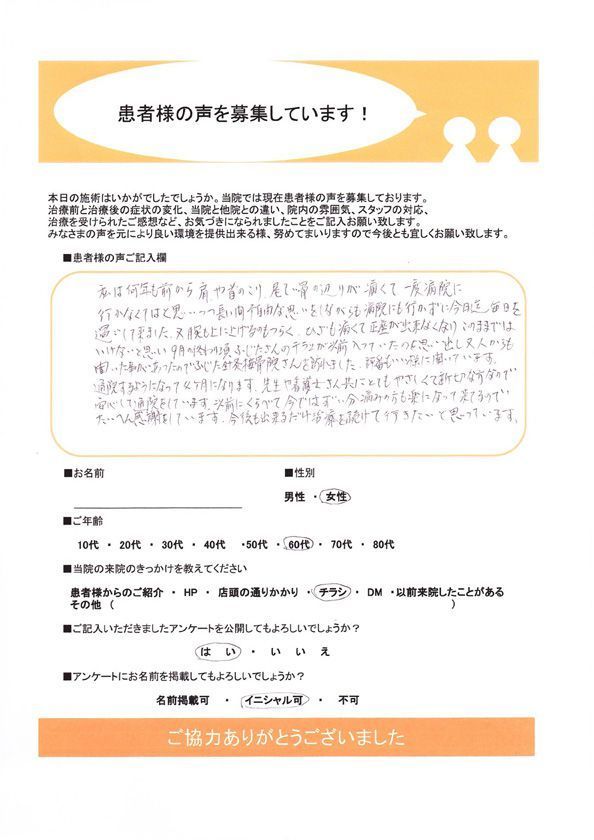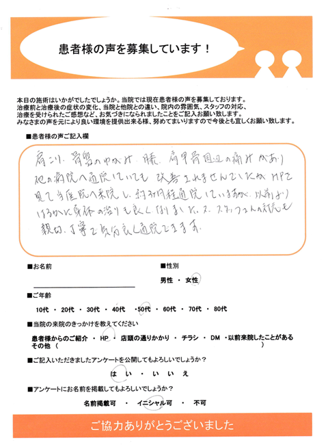 肩こり、骨盤のゆがみ、膝、肩甲骨周辺の痛みがあり、他の病院へ通院していても改善されませんでしたが、HPをみて当医院へ来院し、約3ヵ月程通院していますが、以前よりはるかに身体の治りも良くなりました。