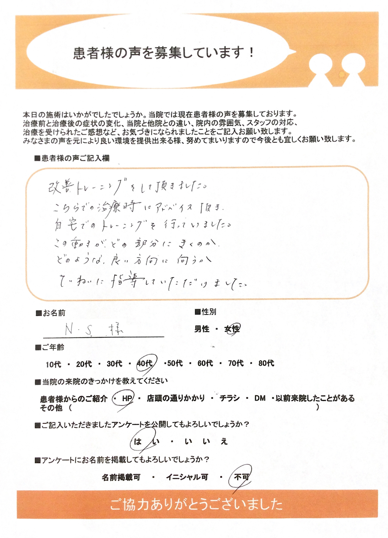 こちらでの治療時にアドバイス頂き、自宅でのトレーニングを行っていました。