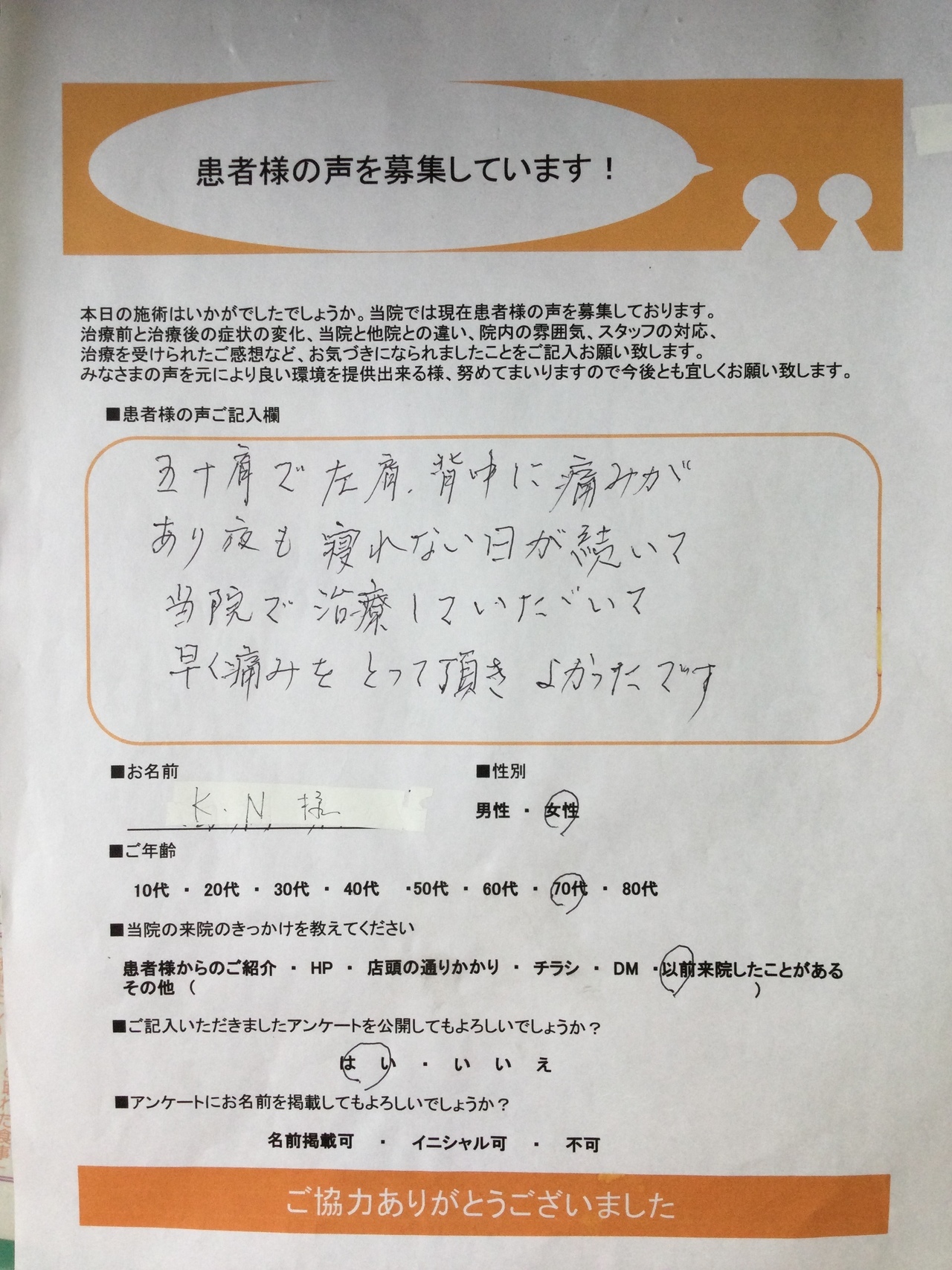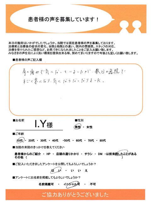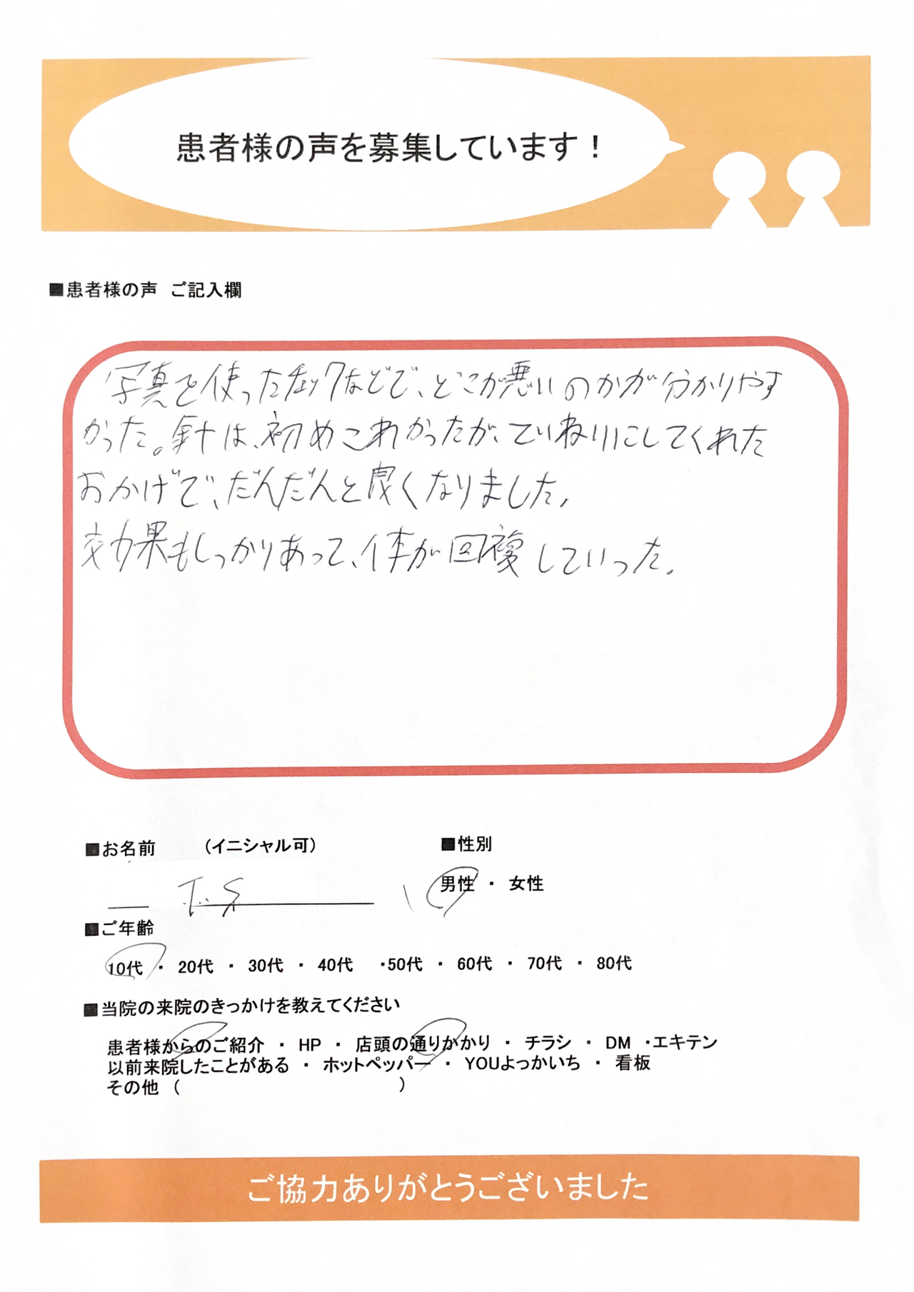 写真を使ったチェックなどで、どこが悪いのかが分かりやすかった。針は初めこわかったが、ていねいにしてくれたおかげで、だんだんと良くなりました。