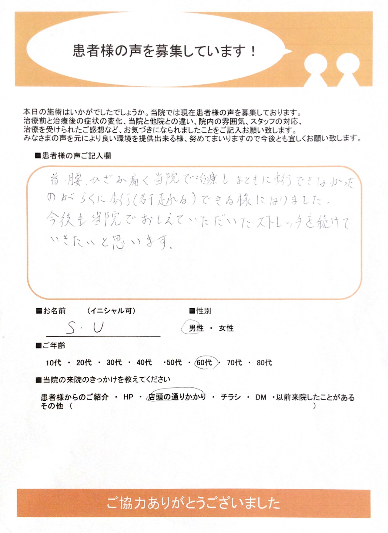 首、腰、ひざが痛く当院で治療し、まともに歩行できなかったのがらくに歩行(若干走れる)できる様になりました。