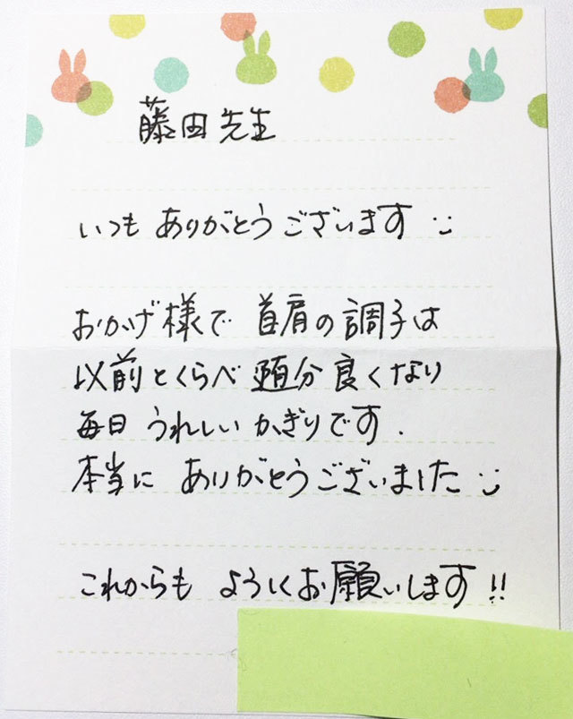 おかげ様で首肩の調子は以前とくらべ随分良くなり、毎日うれしいかぎりです。