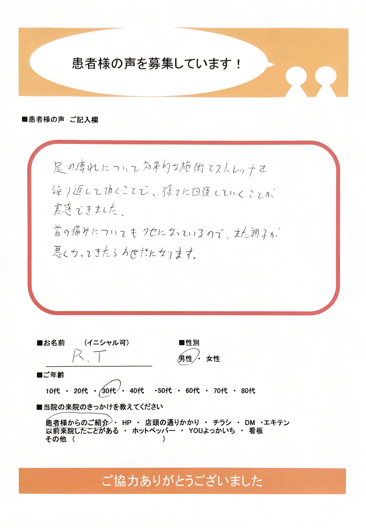 足の痺れについて効果的な施術とストレッチを繰り返して頂くことで、徐々に回復していくことが実感できました。