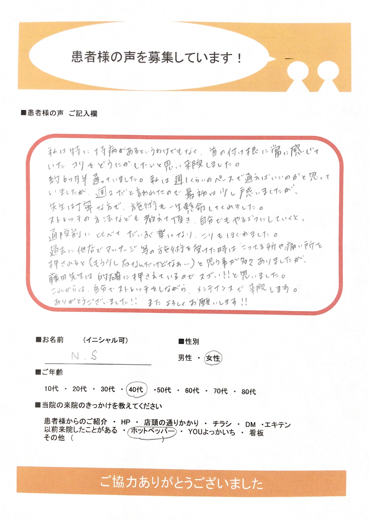 過去に他店でマッサージ等の施術を受けた時はこってる所や痛い所を押されると(もう少し右なんだけどなあ…)と思う事が多々ありましたが、藤田先生は的確に押さえているのでスゴイ!!と思いました。