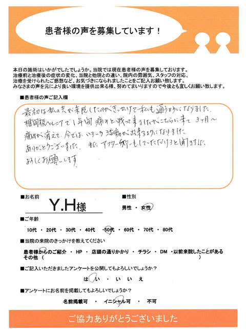 熱心な先生の思いに私も本気で早く治してみせると思うようになり毎日朝のストレッチから1日がはじまる生活を続けています。長年不安症で1錠の薬がやめれなかったのですが、もう経過観察になり断薬できる日が楽しみです。心身ともに不安な日々を送っていた私ですが、自信をもってがんばっていこうと思える様になったのも先生のはげましの言葉があったからです。ほんとうにありがとうございました。