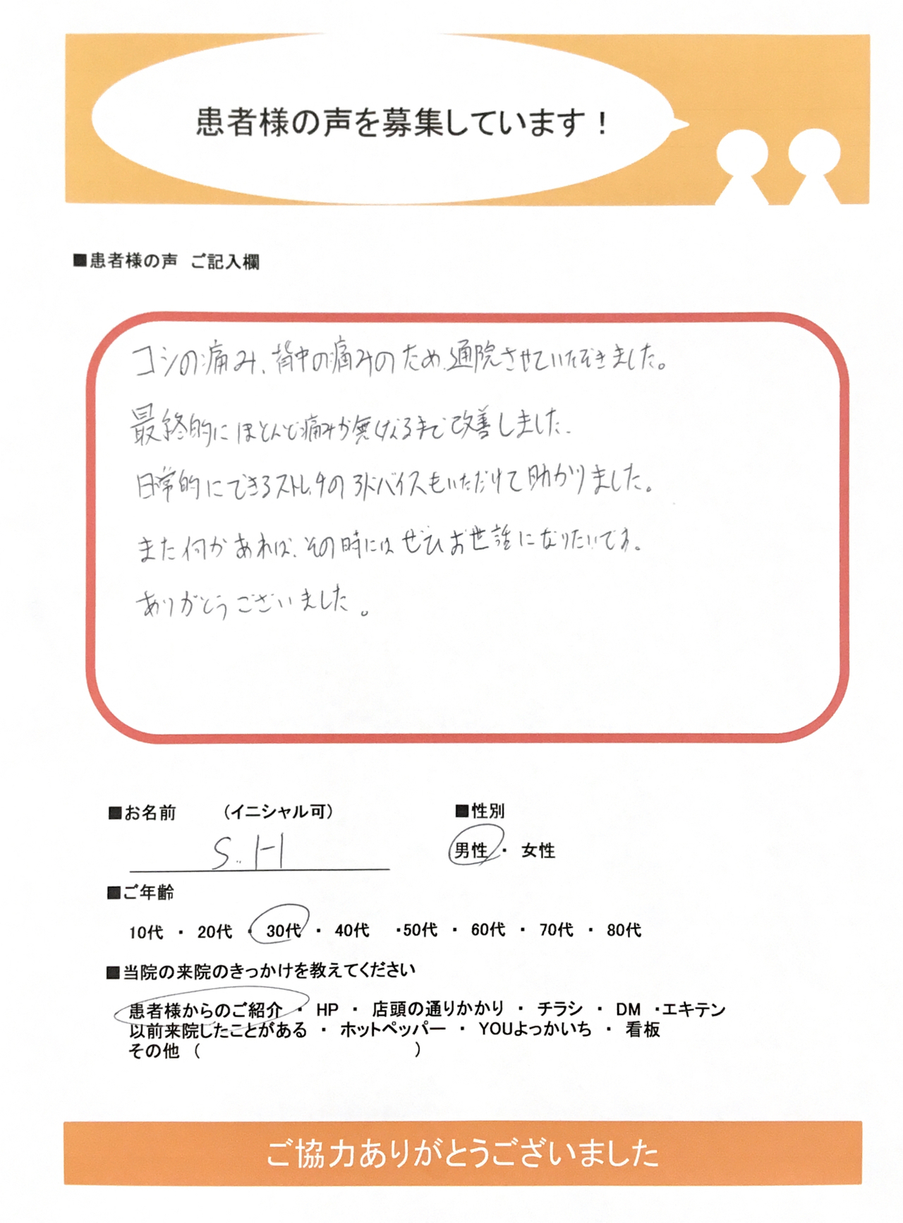 最初は腰痛がひどく色々病院をさがしていて根本的に治したいと思い来院しました。ひどい痛みはすぐになくなりました。左足のコリも徐々に良くなってきました。今では姿勢を正しやすくなり、調子が良いです。
