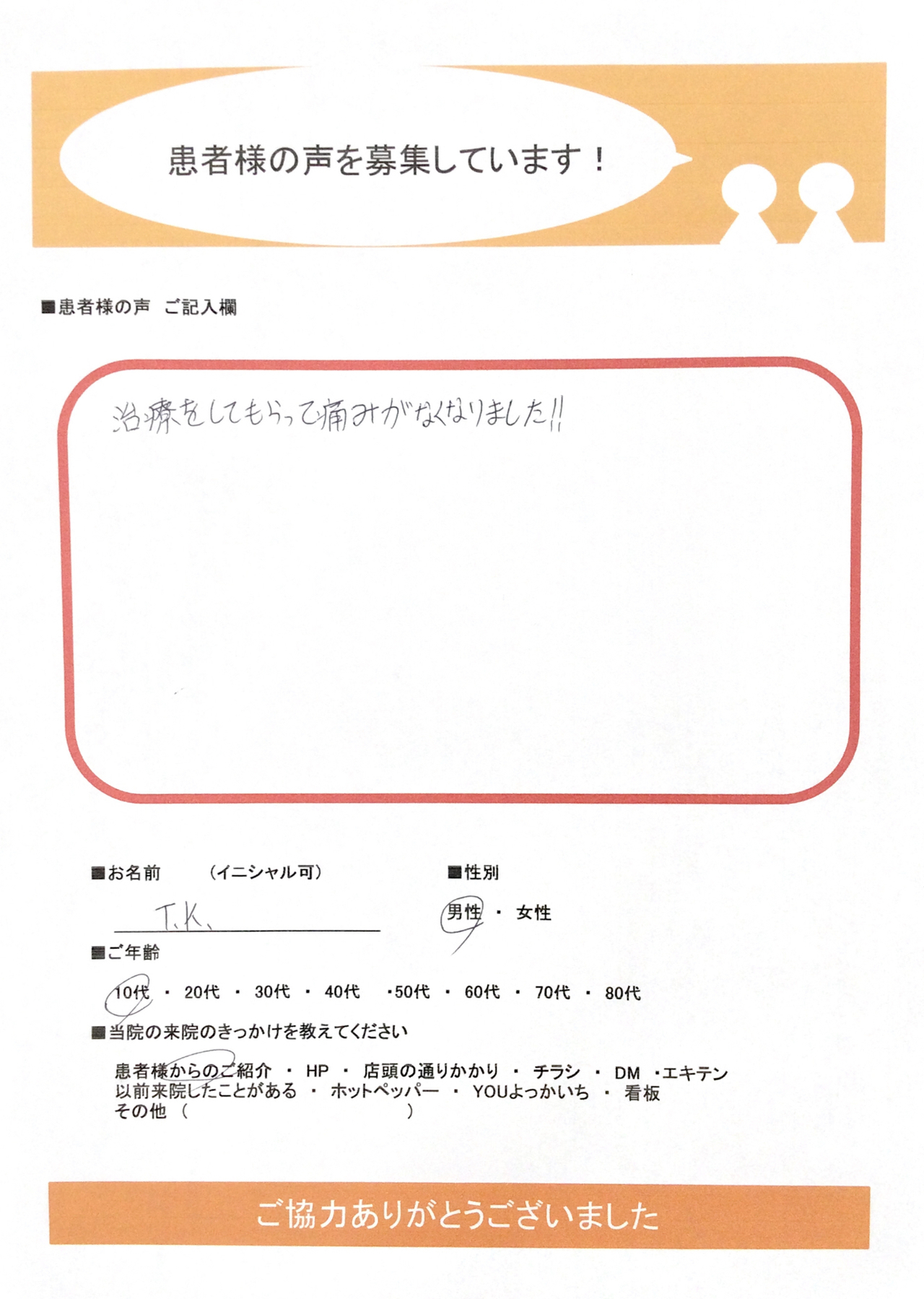 (お母さまから)3回の治療で、どんどん回復していく息子の姿に驚きました。痛みをかかえての生活は苦痛となるので、同じような痛みをかかえた方はぜひこちらへ!とおすすめします。