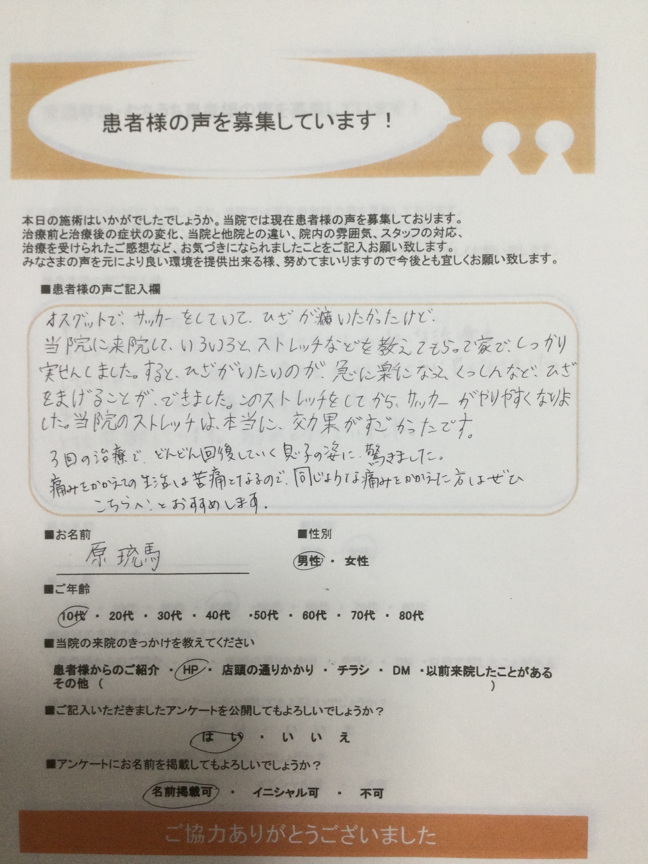 膝の痛みがあったのですが、先生に良くしてもらって、サッカーが出来る様になりました。