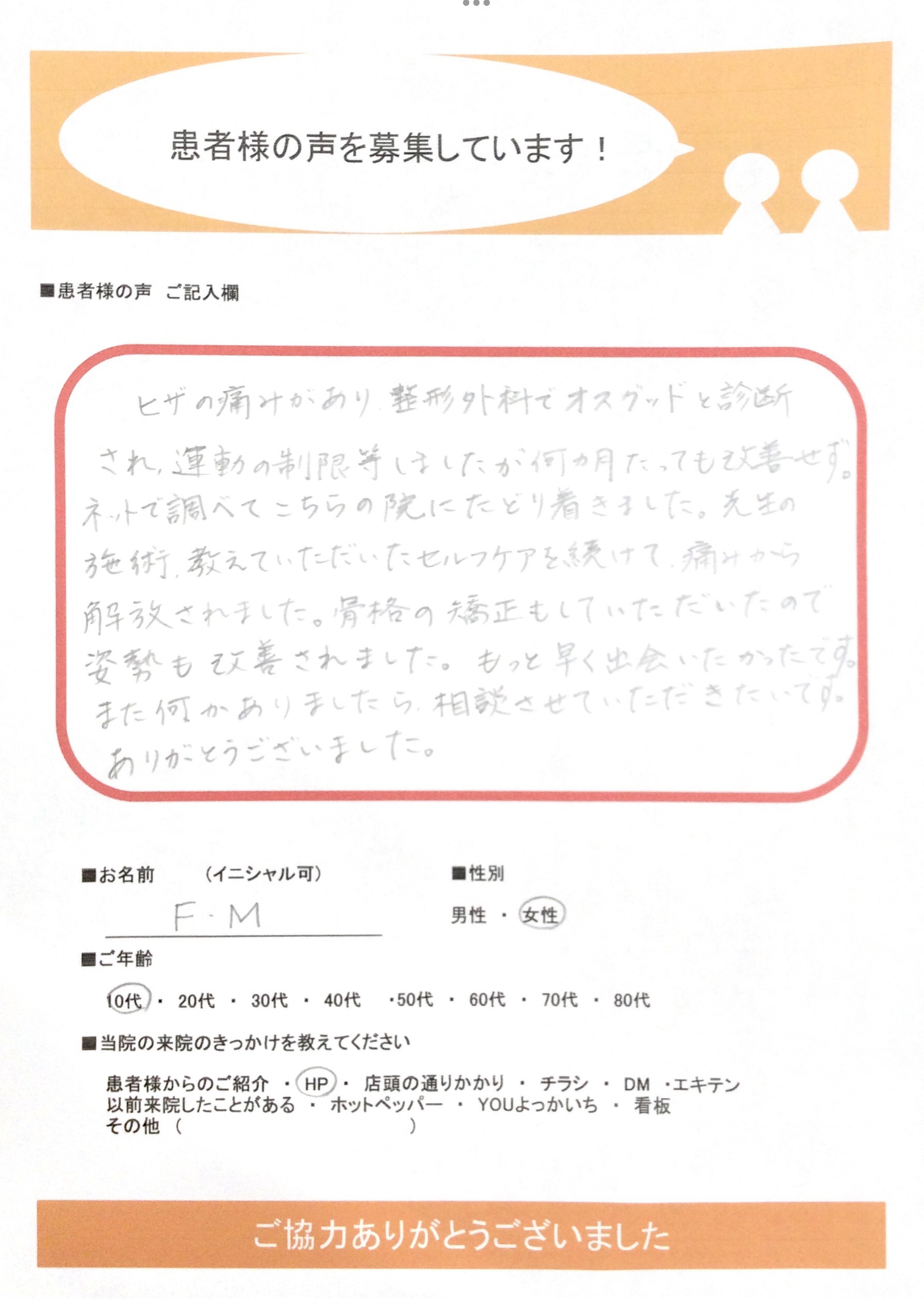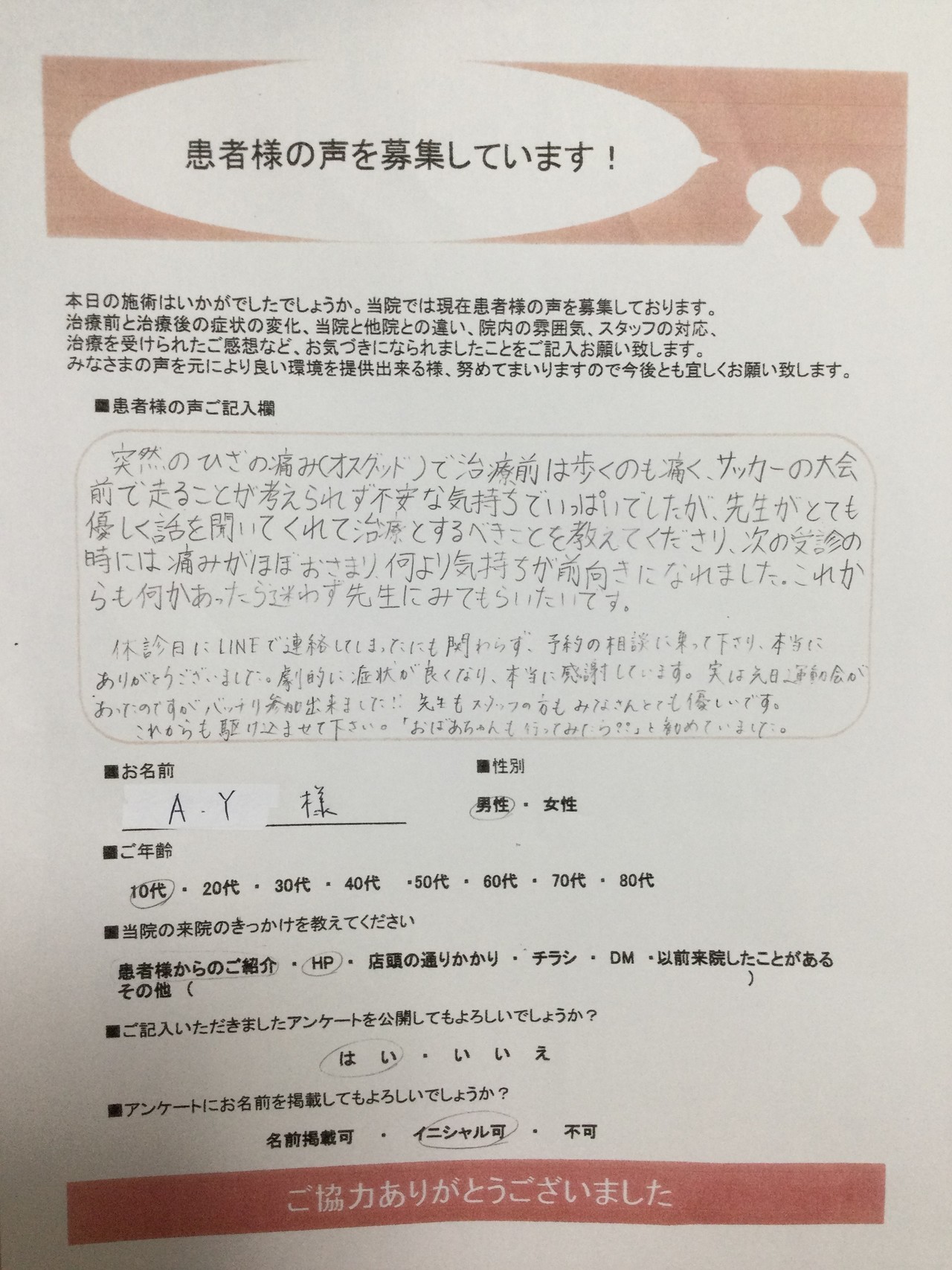 オスグッドで来院しましたが順調ですので今後も故障や痛みの際はお世話になりたいと思っています。
