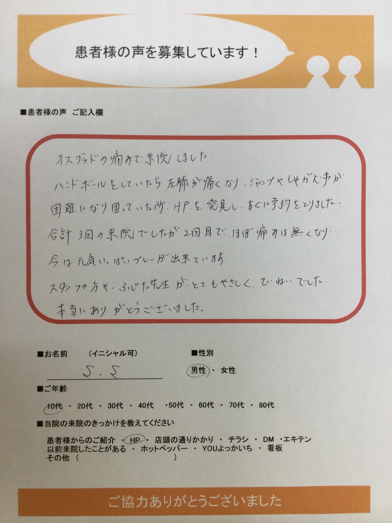 (お母さまから)ヒザが痛いと言っていたらオスグッドと言われ、整形に行きましたが完治に時間がかかると言われました。練習中や練習後の痛みを早く軽減させてあげたくて来ました。指導と施術、本人のがんばりで治りました。
