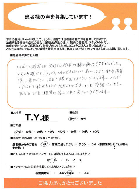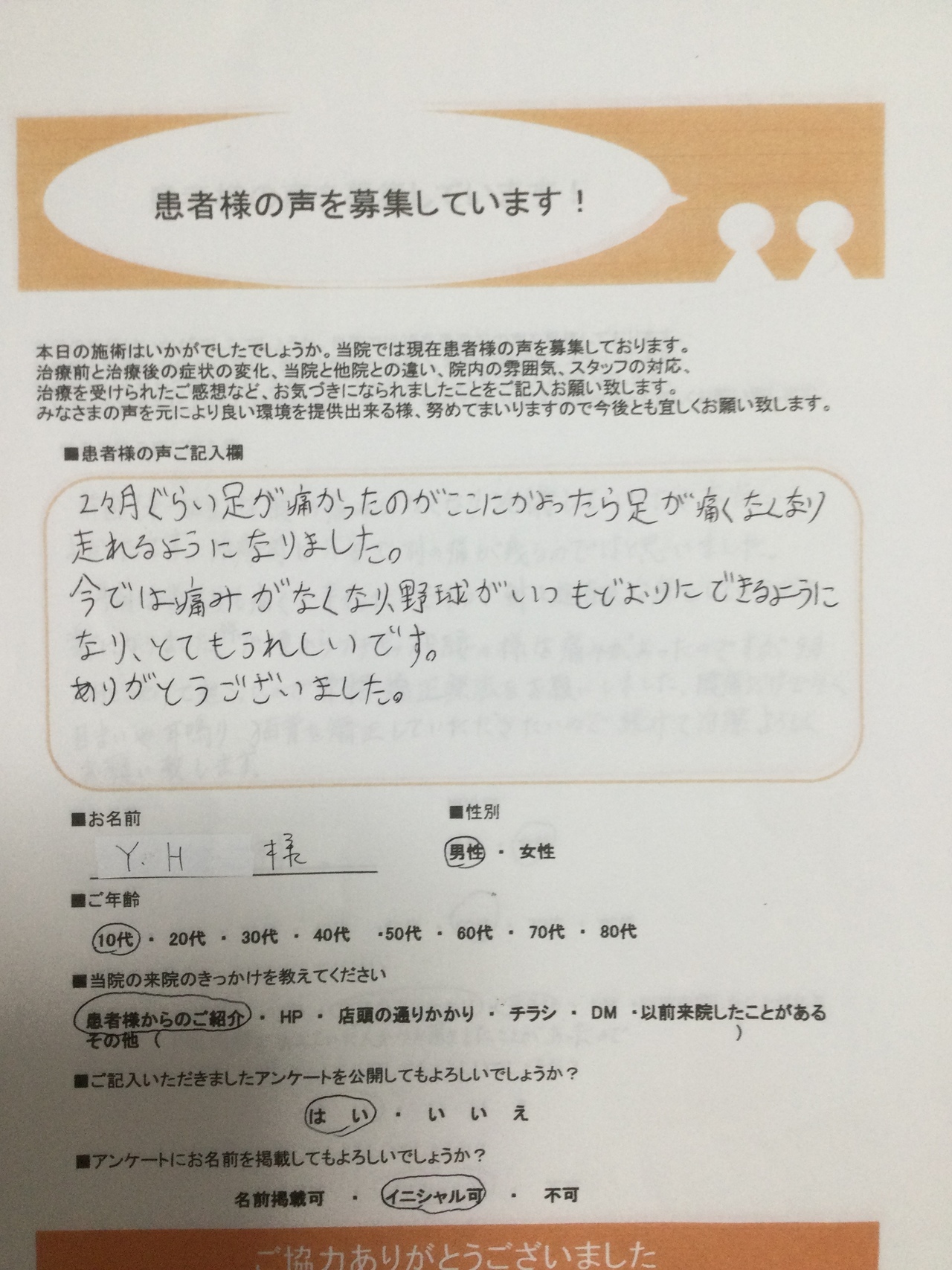 最初は、ひざがすごく痛くて歩くのも無理でした。でも先生に指導してもらってセルフケアを学校でも忘れずしていたら、びっくりするほどいたみがなくなりました。野球の試合の前にもセルフケアをして試合をするといたみがなくなりました。今までありがとうございました。ひざがいたい友達がいたら紹介したいと思います。