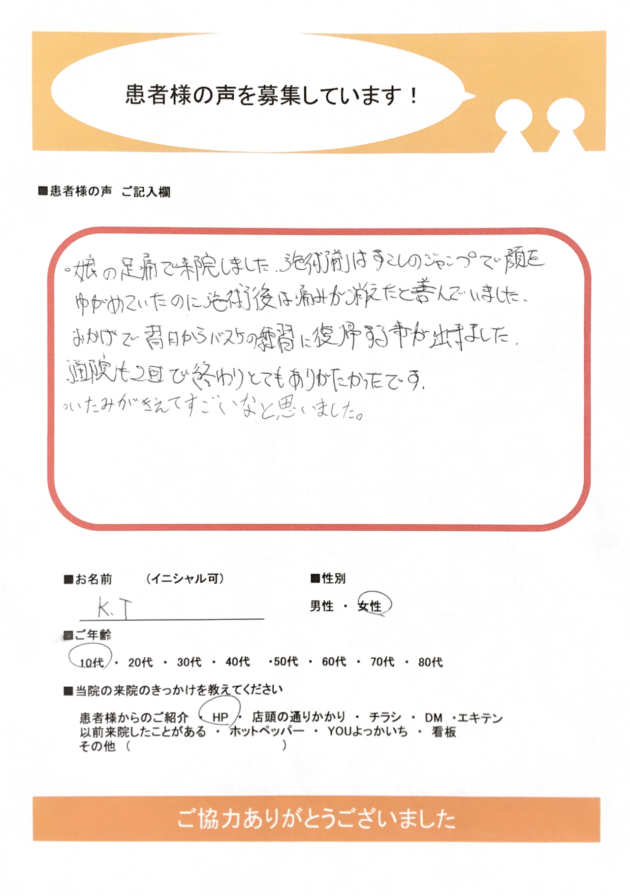 (お母さまから)休診日にLINEで連絡してしまったにも関わらず、予約の相談に乗って下さり、本当にありがとうございました。劇的に症状が良くなり、本当に感謝しています。実は先日運動会があったのですが、バッチリ参加できました!!先生もスタッフの方もみなさんとても優しいです。これからも駆け込ませて下さい。「おばあちゃんも行ってみたら??」と勧めていました。