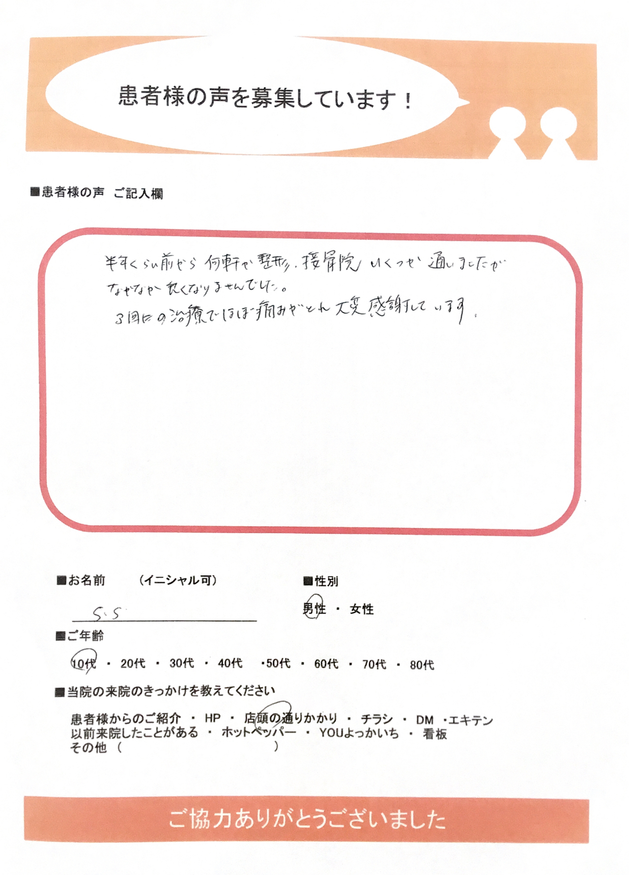 半年くらい前から何軒か整形・接骨院いくつか通いましたがなかなか良くなりませんでした。3回の治療でほぼ痛みがとれ大変感謝しています。