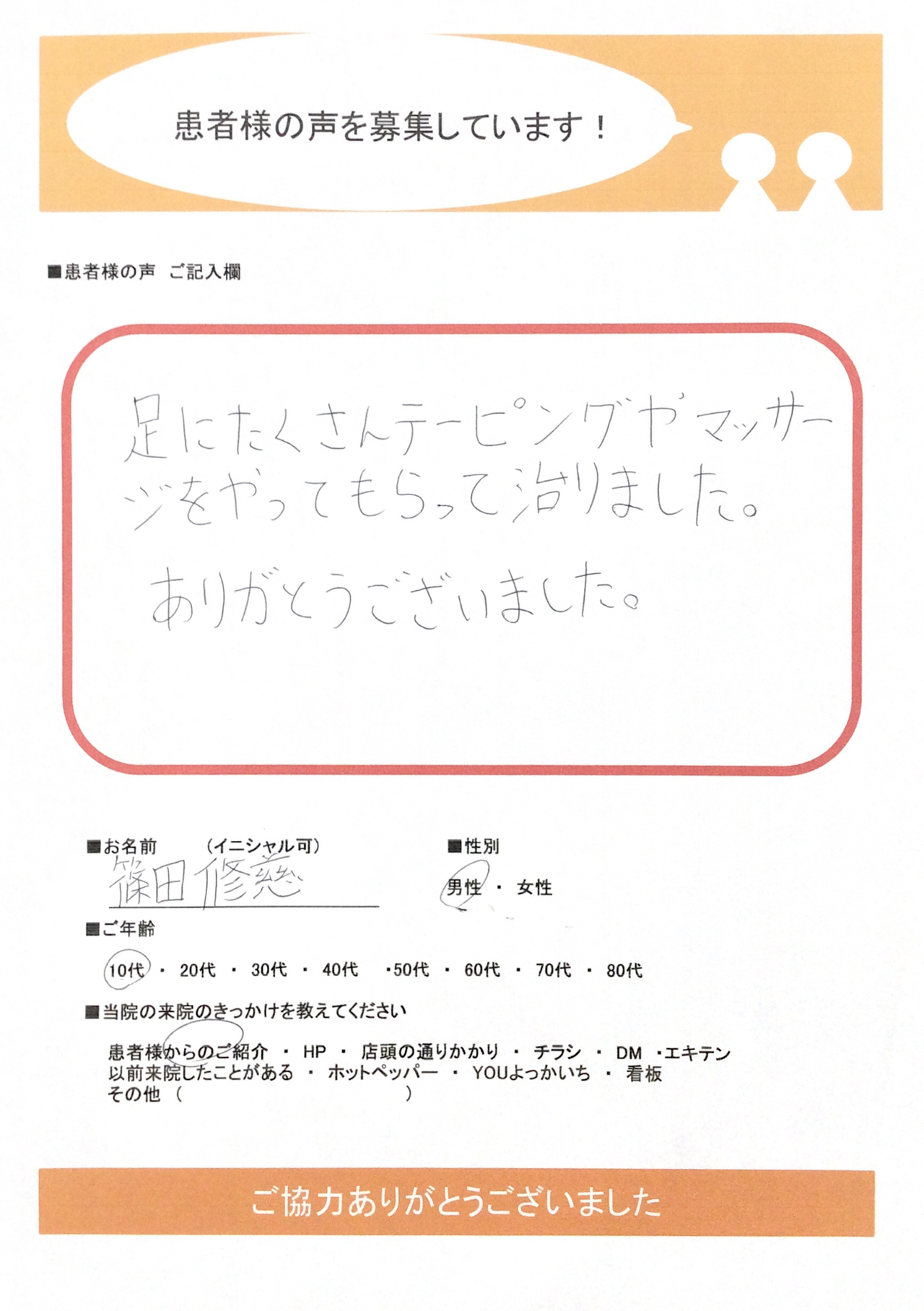 足にたくさんテーピングやマッサージをやってもらって治りました。