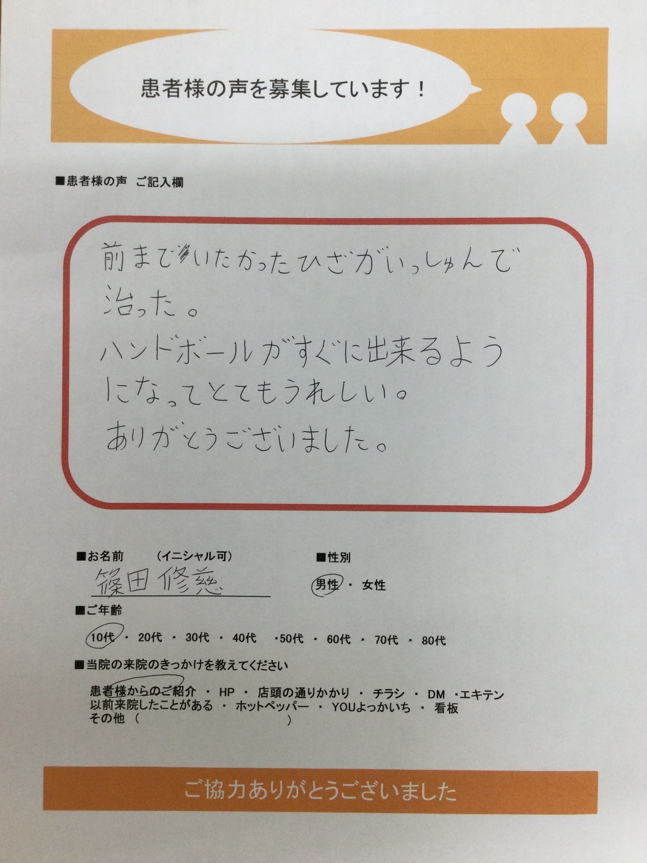 ハンドボールをしていたら左膝が痛くなり、ジャンプやしゃがむ事が困難になり困っていた所、HPを発見しすぐに予約をとりました。