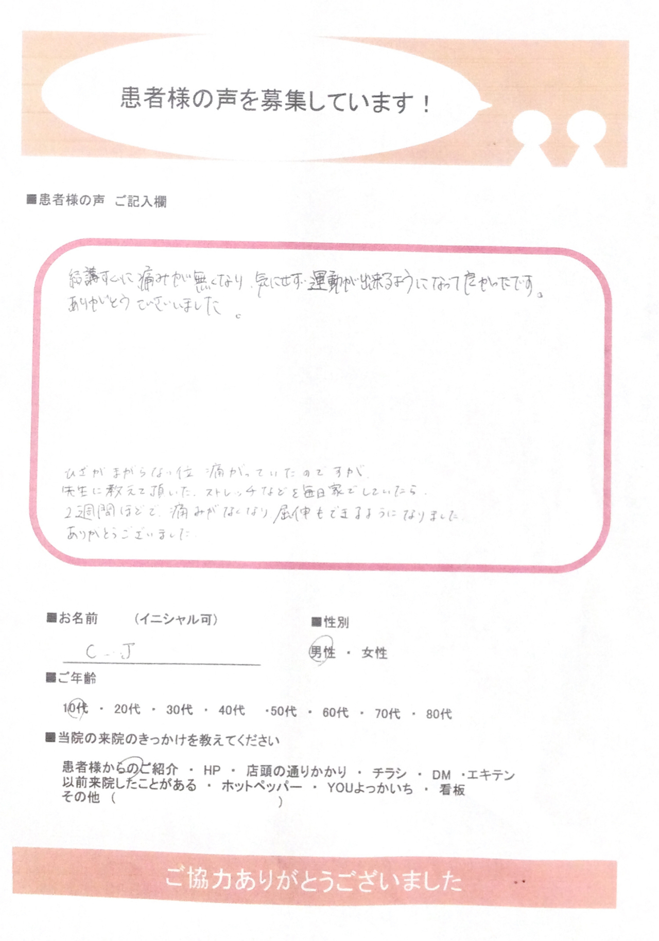 結構すぐに痛みが無くなり、気にせず運動が出来るようになって良かったです。ありがとうございました。