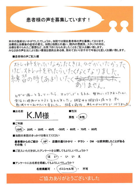 (お母さまから)ひざがまがらない位痛がっていたのですが、先生に教えて頂いたストレッチなどを毎日家でしていたら、2週間ほどで痛みがなくなり屈伸もできるようになりました。ありがとうございました。