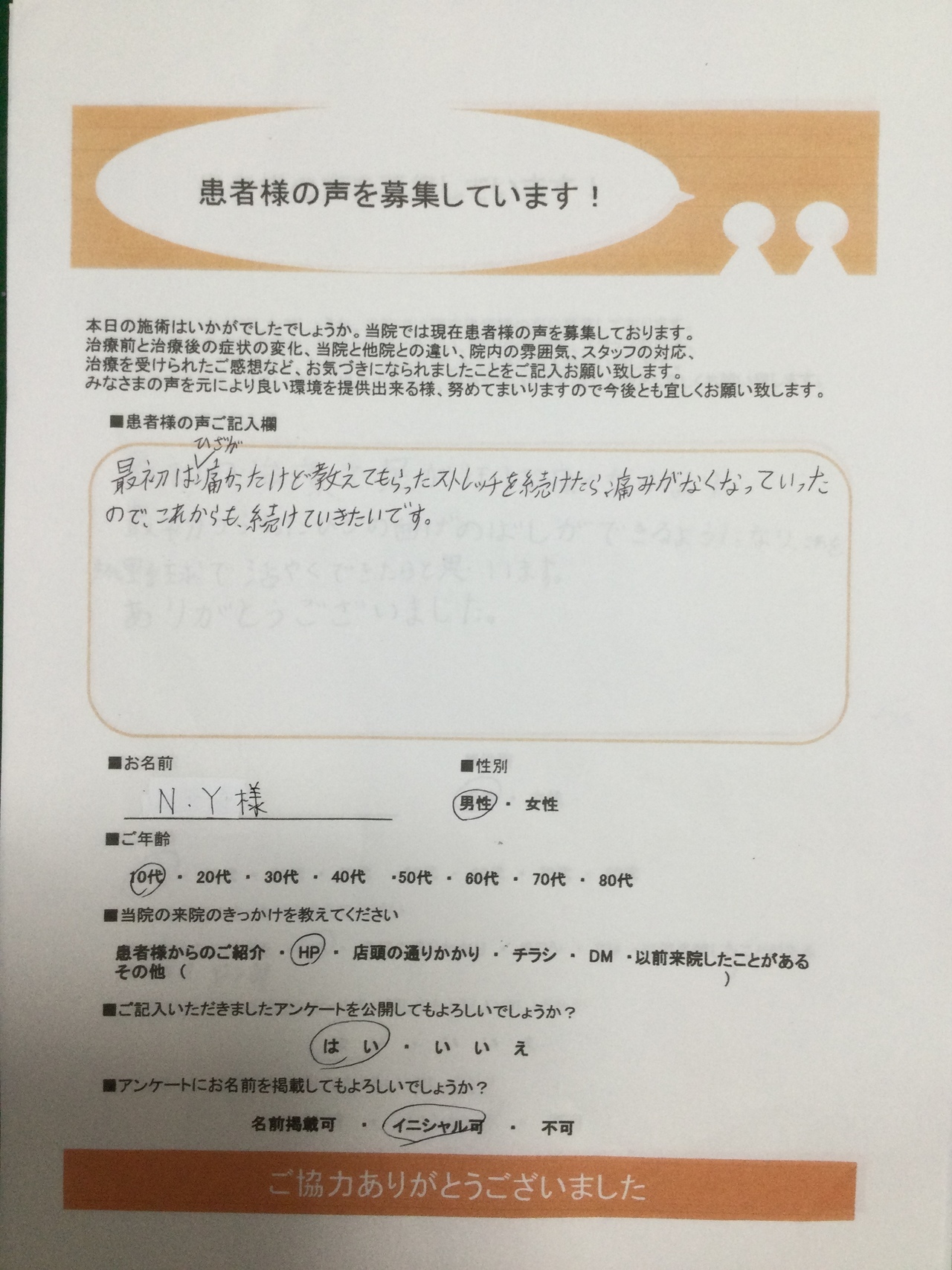 ひざがまがらない位痛がっていたのですが、先生に教 えて頂いたストレッチなどを毎日家でしていたら2週間ほどで痛みがなくなり屈伸もできるようになりました。