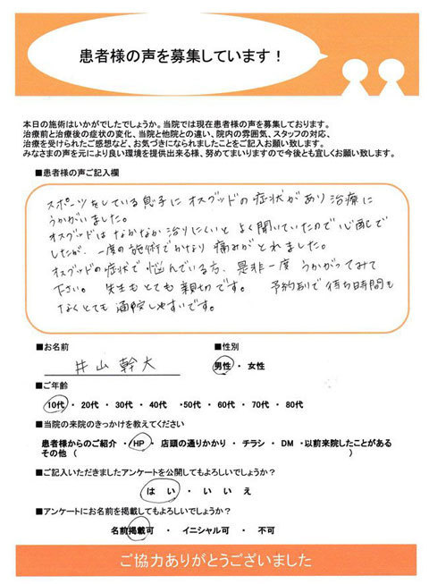 突然のひざの痛み(オスグッド)で治療前は歩くのも痛く、サッカーの大会前で走ることが考えられず不安な気持ちでいっぱいでしたが、先生がとても優しく話を聞いてくれて治療と、するべきことを教えてくださり、次の受診の時には痛みがほぼおさまり、何より気持ちが前向きになれました。これからも何かあったら迷わず先生にみてもらいたいです。