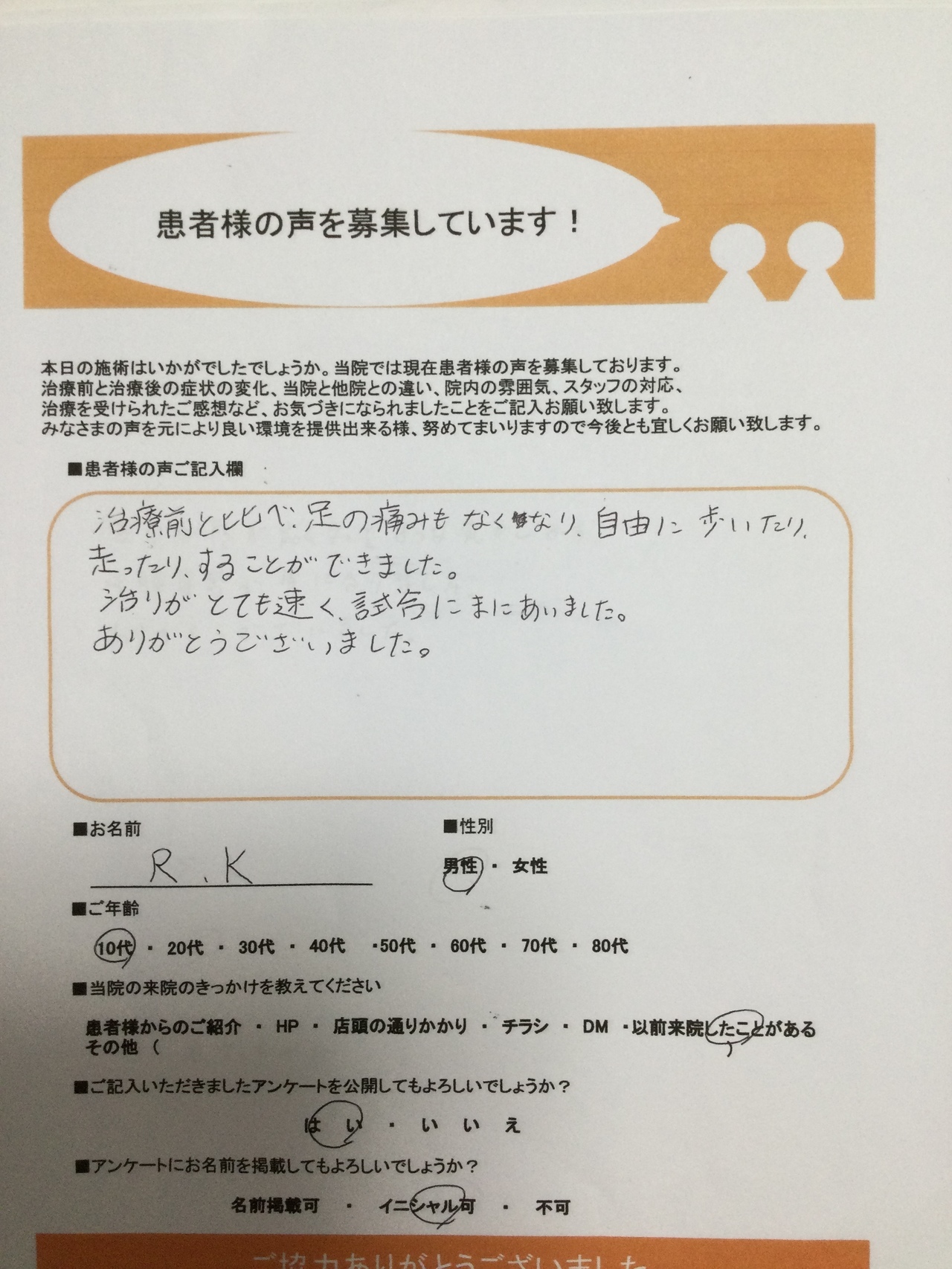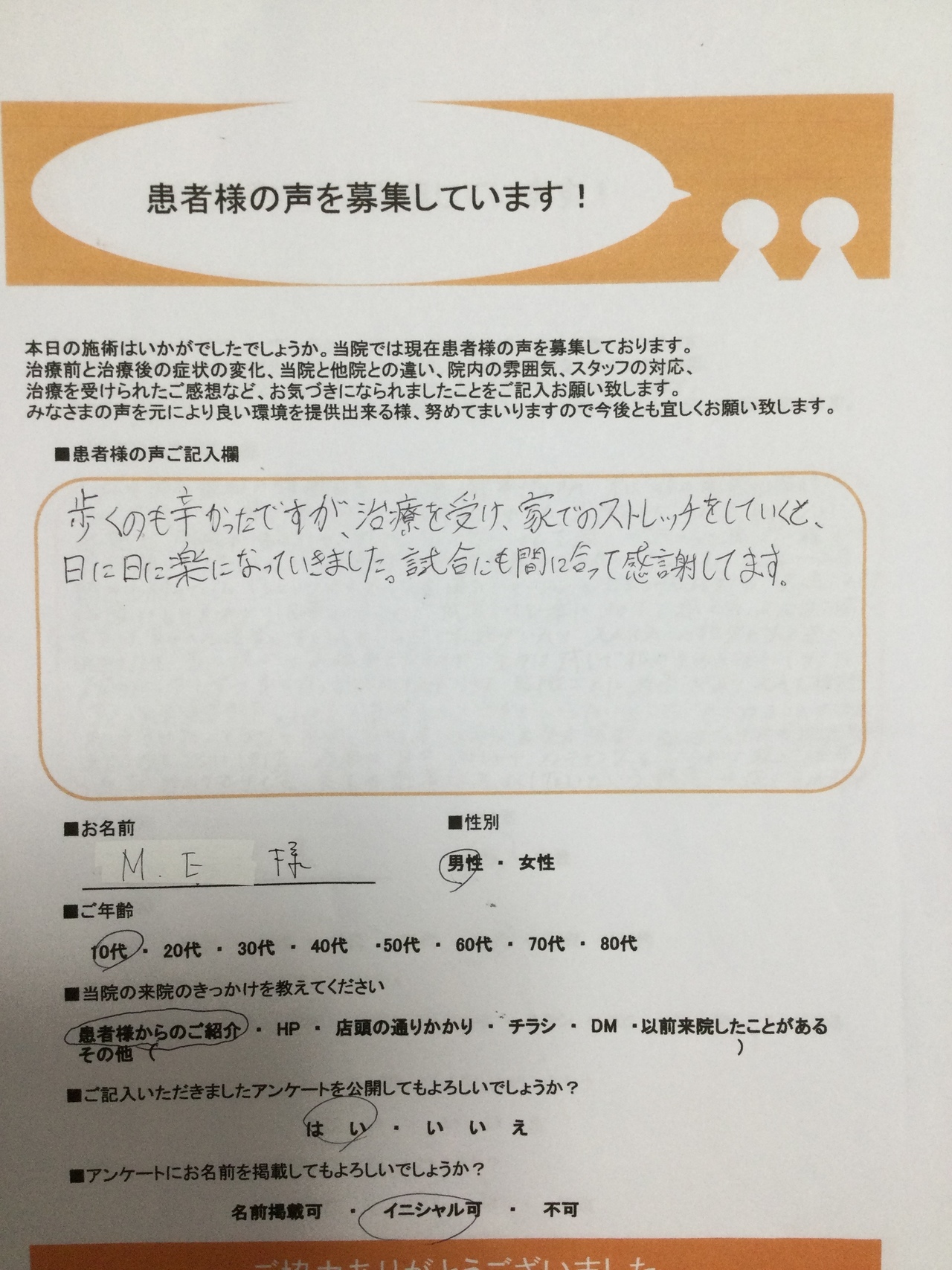 歩くのも辛かったですが、治療を受け、家でのストレッチをしていくと、日に日に楽になっていきました。試合にも間に合って感謝してます。