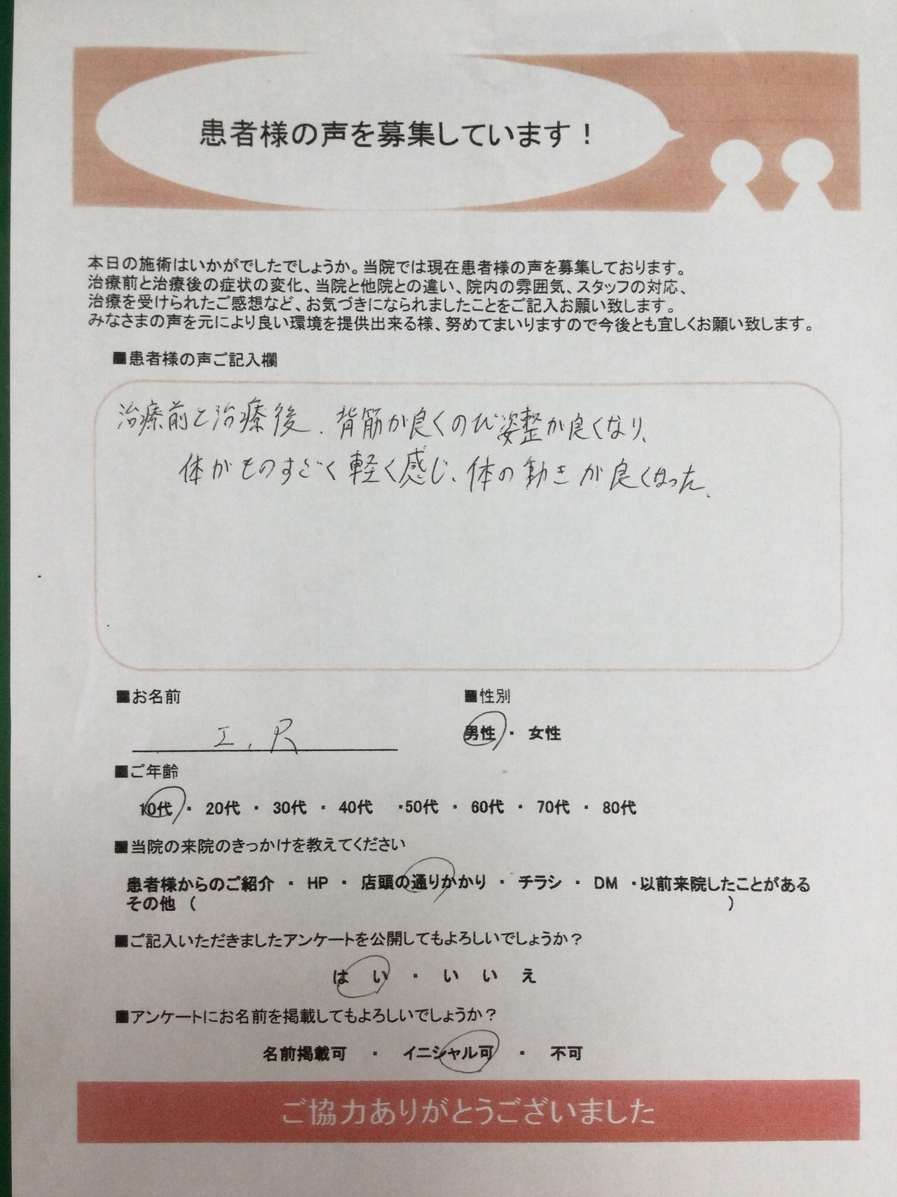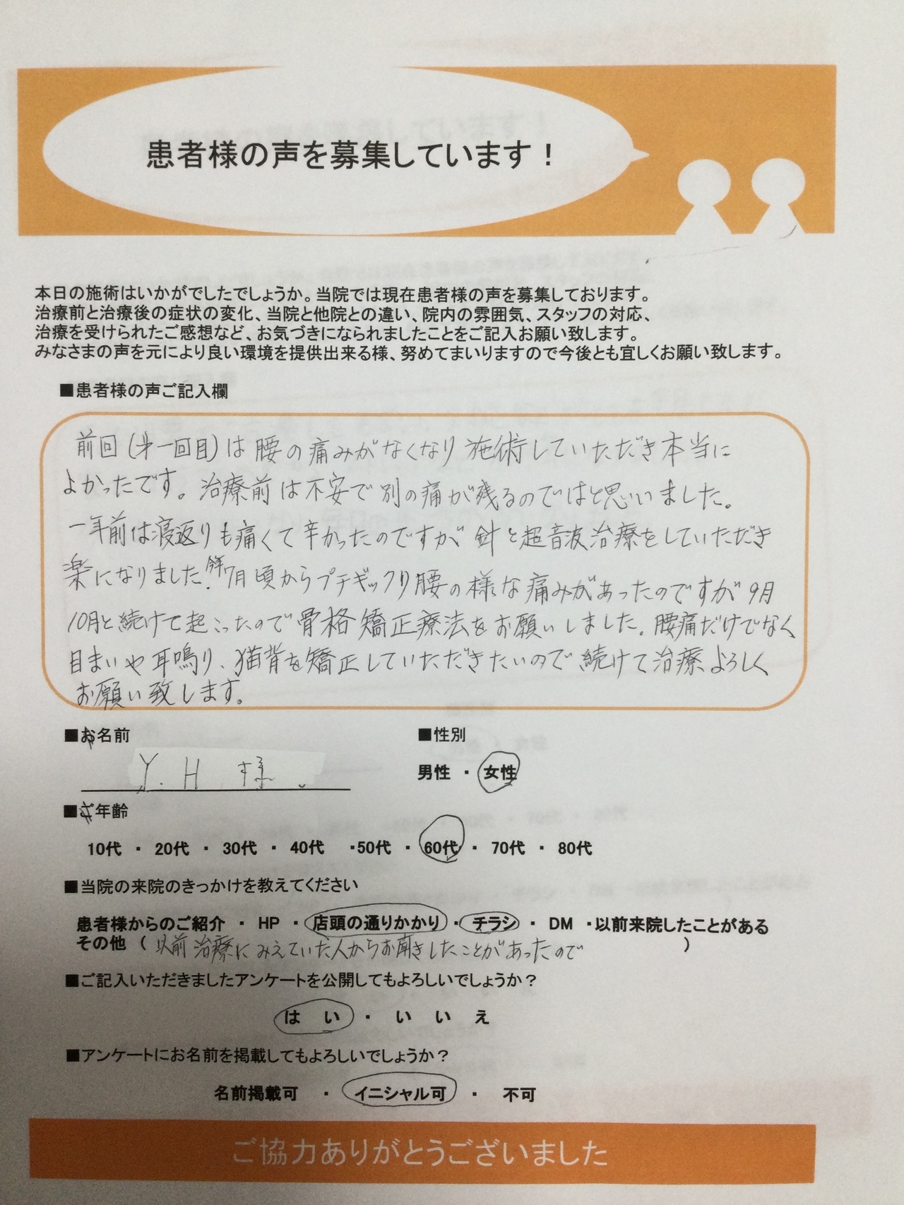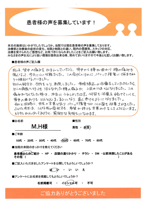 前回(第一回目)は腰の痛みがなくなり施術していただき本当によかったです。治療前は不安で別の痛みが残るのではと思いました。一年前は寝返りも痛くて辛かったのですが針と超音波治療をしていただき楽になりました。今年7月頃からプチギックリ腰の様な痛みがあったのですが9月、10月と続けて起こったので骨格矯正療法をお願いしました。腰痛だけでなく目まいや耳鳴り、猫背を矯正していただきたいので続けて治療よろしくお願い致します。