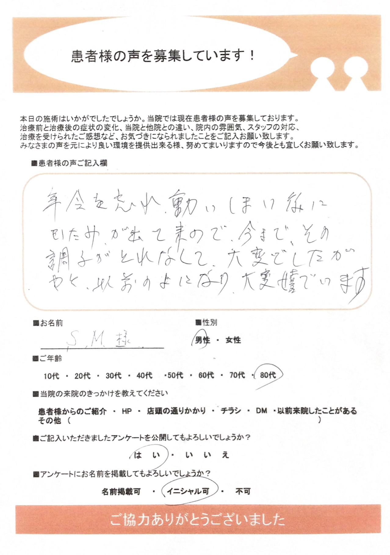 年令を忘れ動いてしまい後にいたみが出て来たので、今までその調子がとれなくて大変でしたが、やっと以前のようになり大変喜んでいます