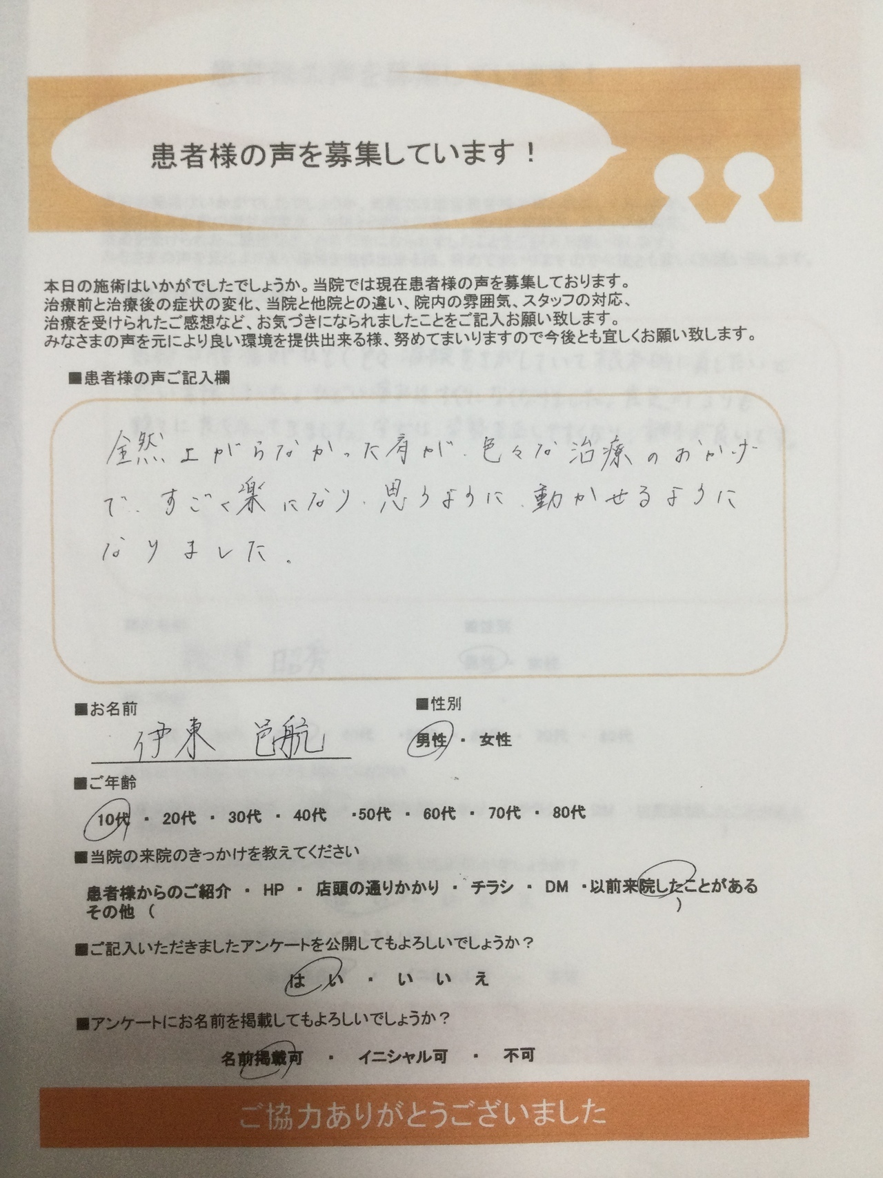 全然上がらなかった肩が、色々な治療のおかげですごく楽になり、思うように動かせるようになりました。