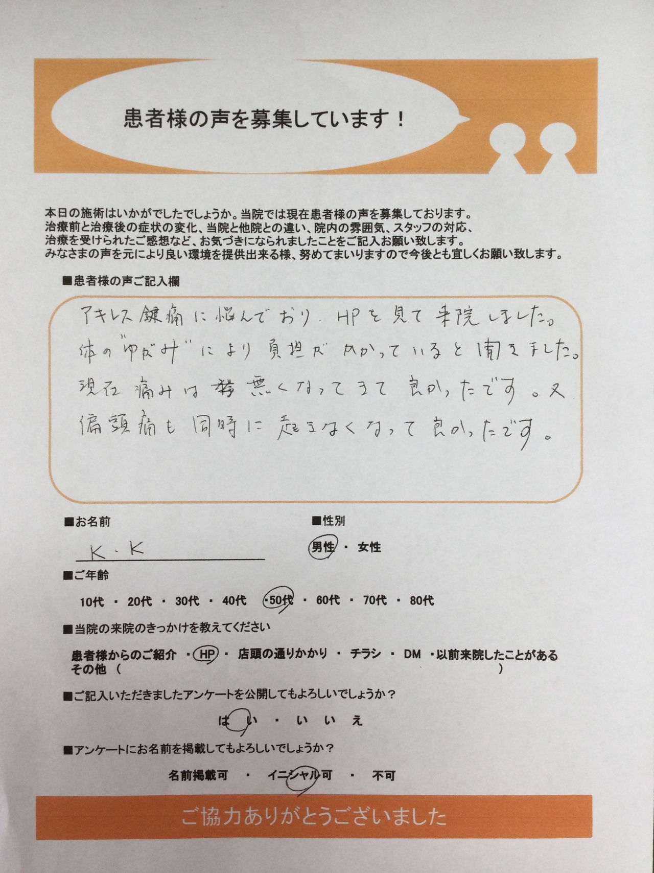 アキレス腱痛に悩んでおり、HPを見て来院しました。